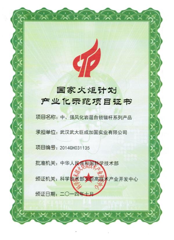 2014年科學技術部“國家火炬計劃產業化示范項目證書”