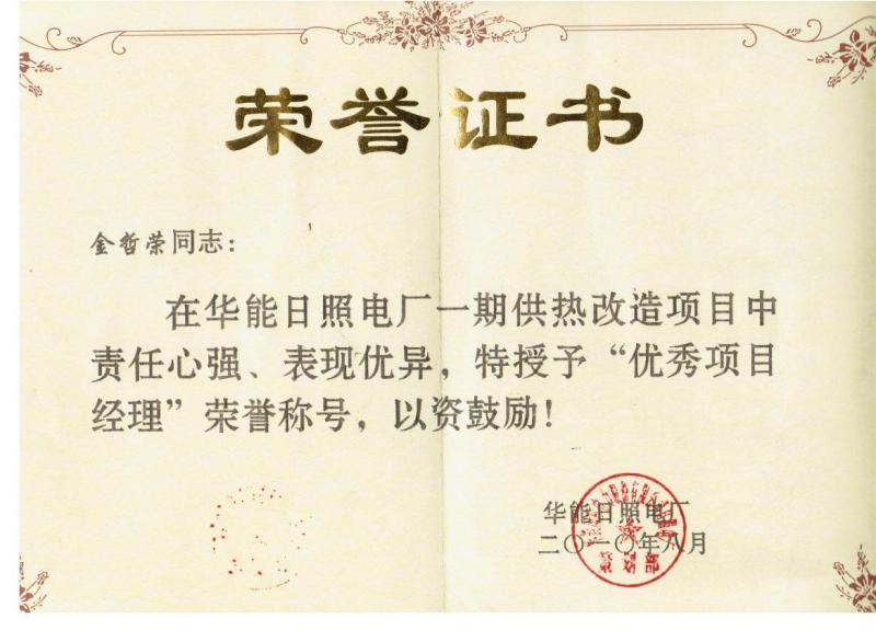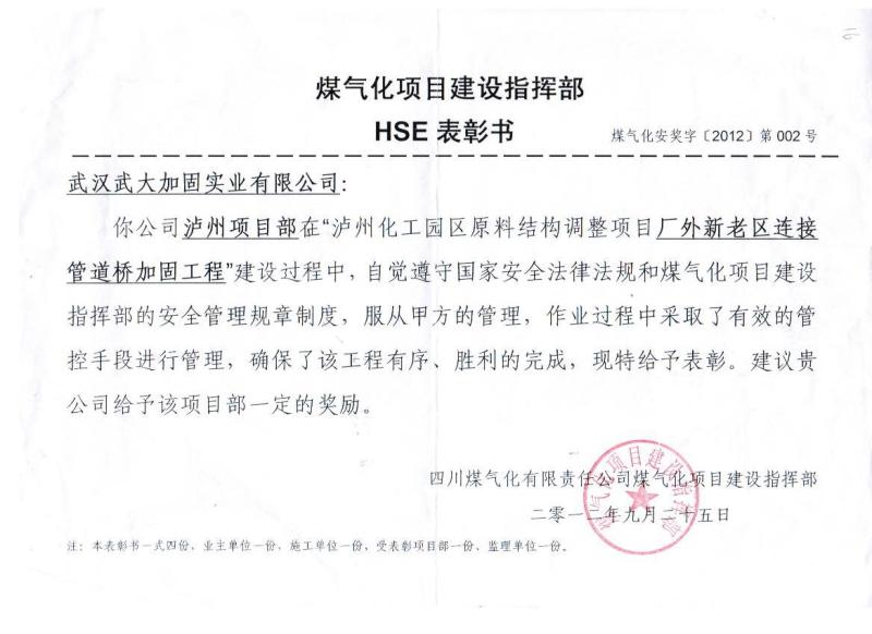 2012年四川煤氣化有限責任公司“HSE表彰書”
