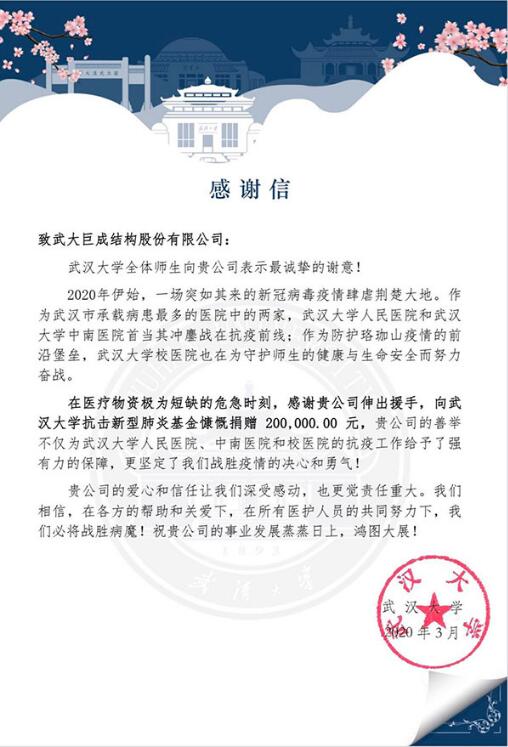 2020年向“武漢大學抗擊新型冠狀病毒感染肺炎基金”捐款20...