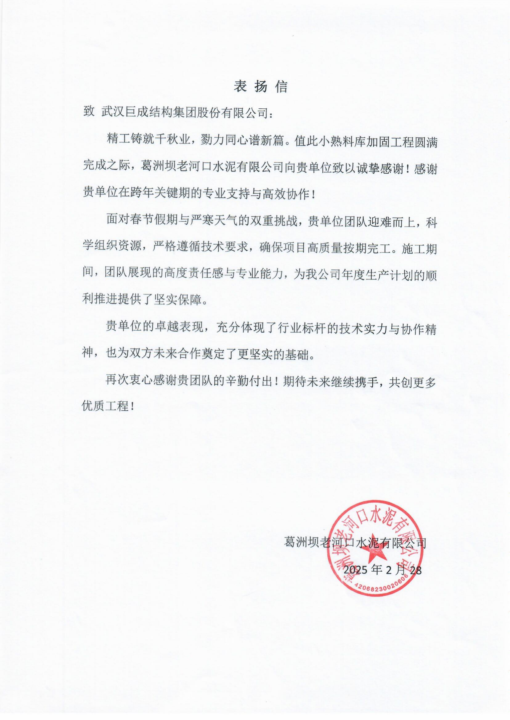 2025年葛洲壩老河口水泥有限公司 表揚信