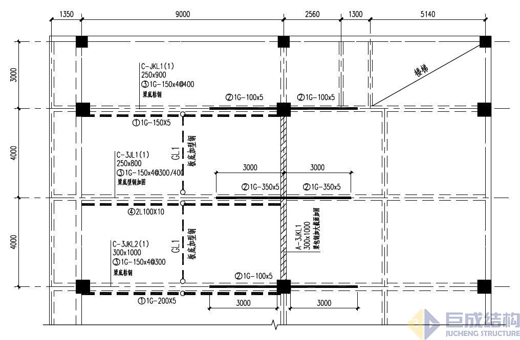 2)粘結(jié)型鋼改變傳力途徑加固法:適用于原結(jié)構(gòu)樓面荷載大幅度提高或增加較大局部荷載,通過在板底粘型鋼改變傳力途徑或減小跨度提高樓板承載力;