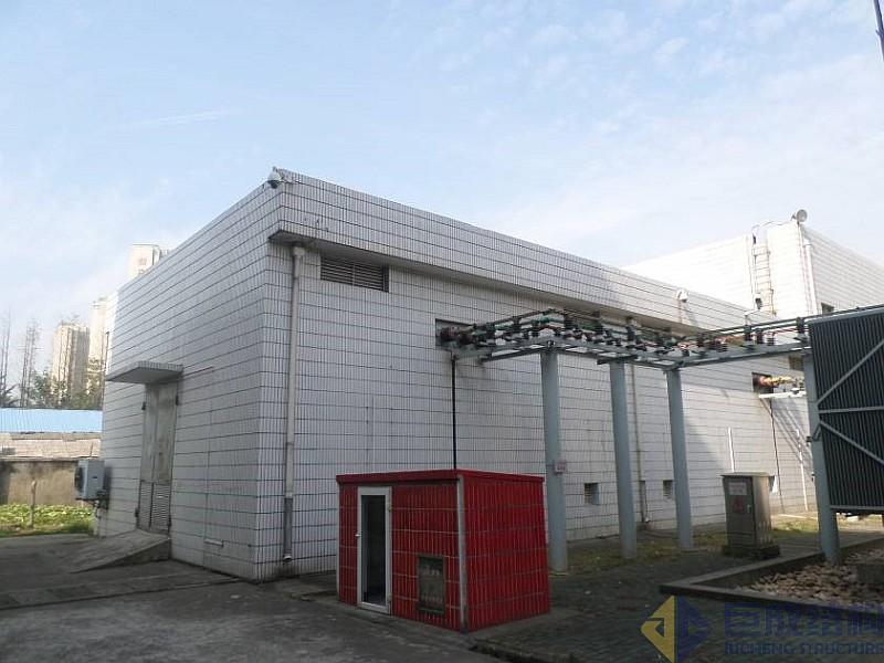 主控樓建筑平面呈菜刀形布置,建筑總長約37.3m,總寬約12.2m,主體結構為兩層(南側配電室為一層)框架結構,建筑總高約為11.1m,總建筑面積約594.1m2。主控樓一樓南側為配電室,北側為電容器室、雜物間及廚房,二樓為控制室及資料室。