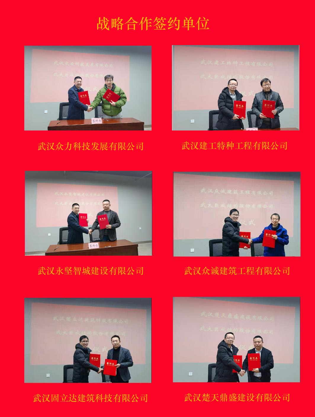 2020年12月24日,公司在巨成大廈四樓再次舉行湖北加固改造企業戰略合作協議簽訂儀式,本次簽約單位有武漢眾力科技發展有限公司、武漢建工特種工程有限公司、武漢眾誠建筑工程有限公司、武漢永堅智城建設有限公司、武漢楚天鼎盛建設有限公司、武漢固立達建筑科技有限公司。公司總經理萬雄衛、副總經理廖杰洪、副總經理張暢、營銷公司相關負責人參加了本次簽約儀式。