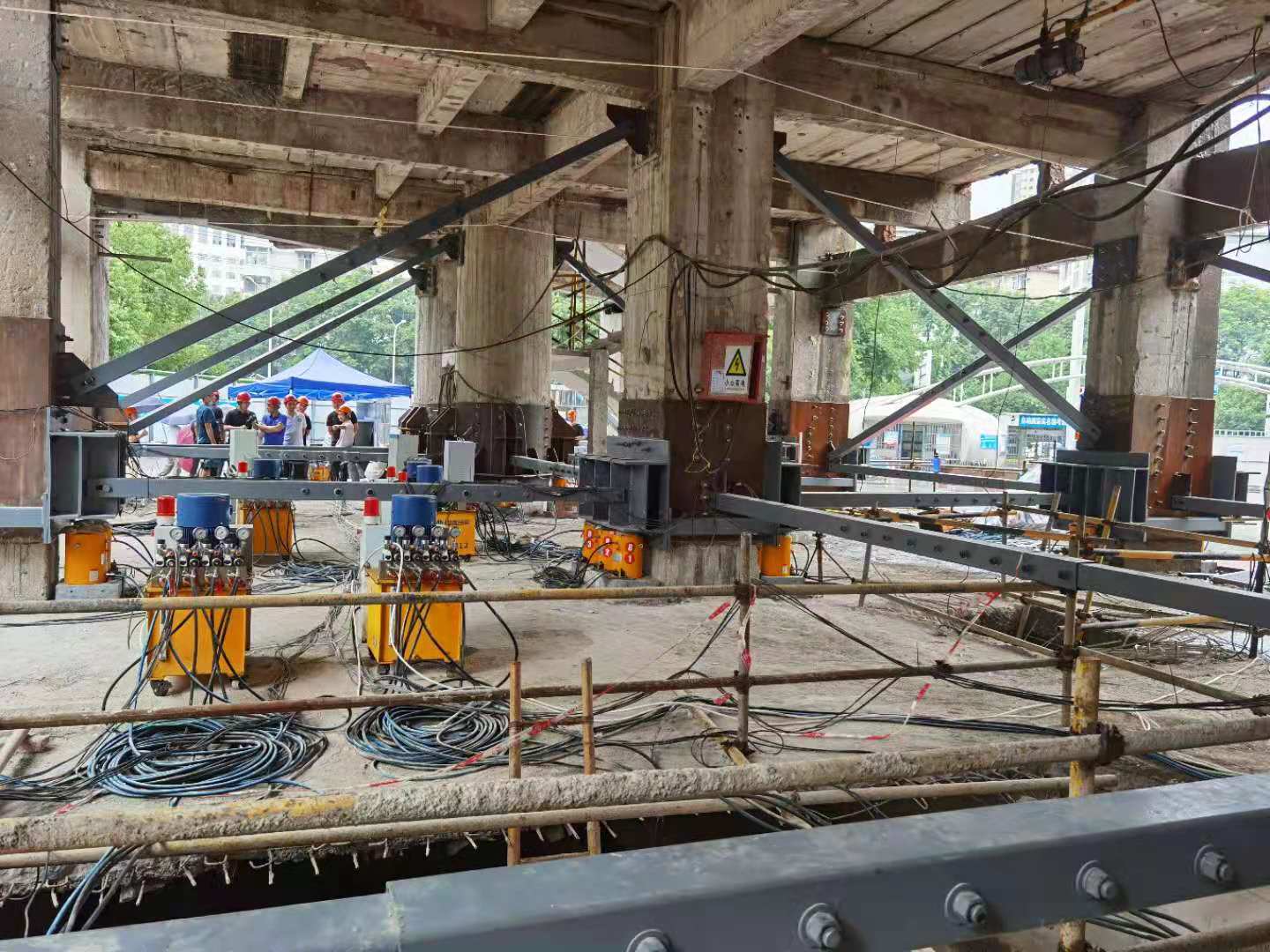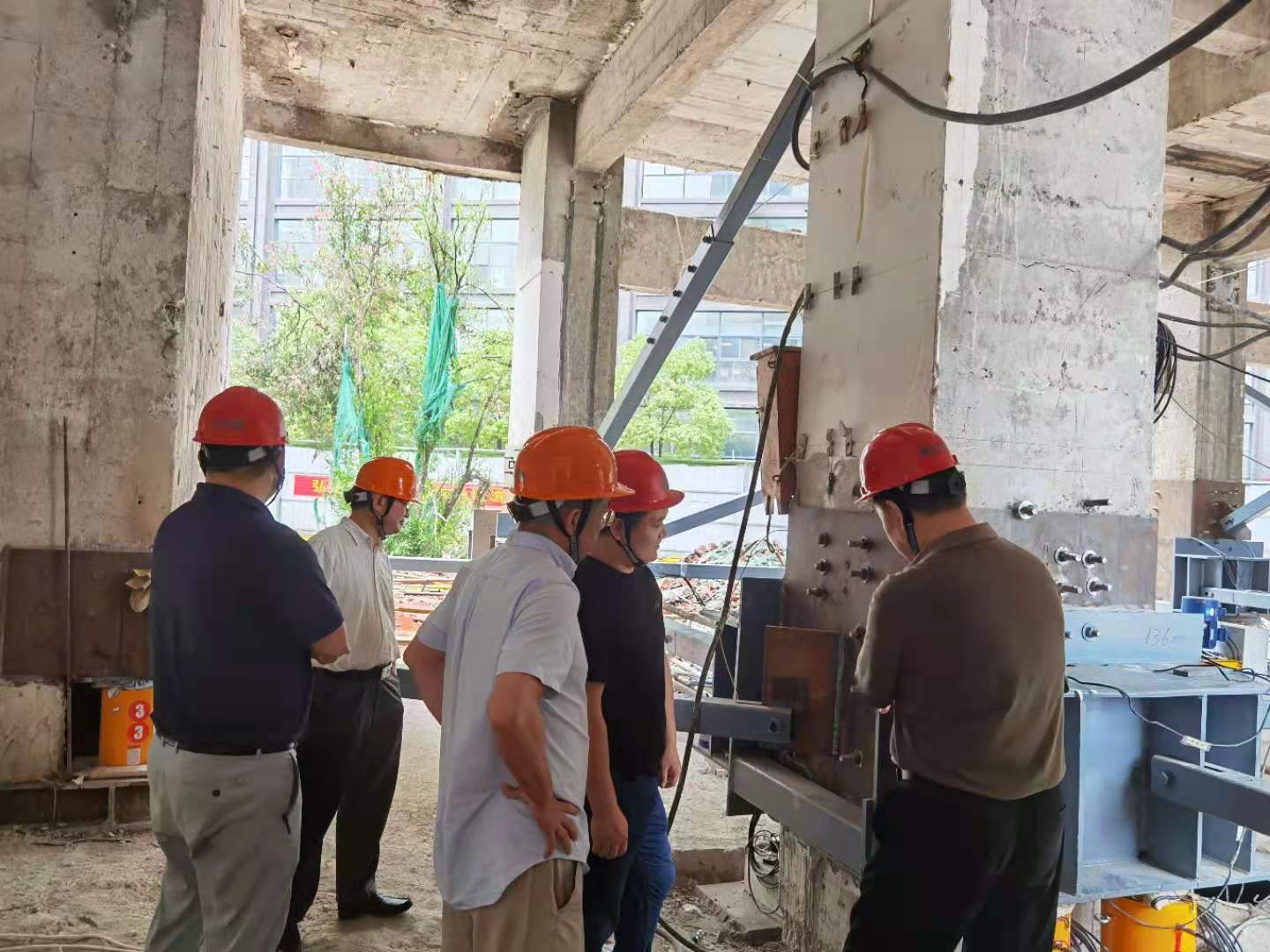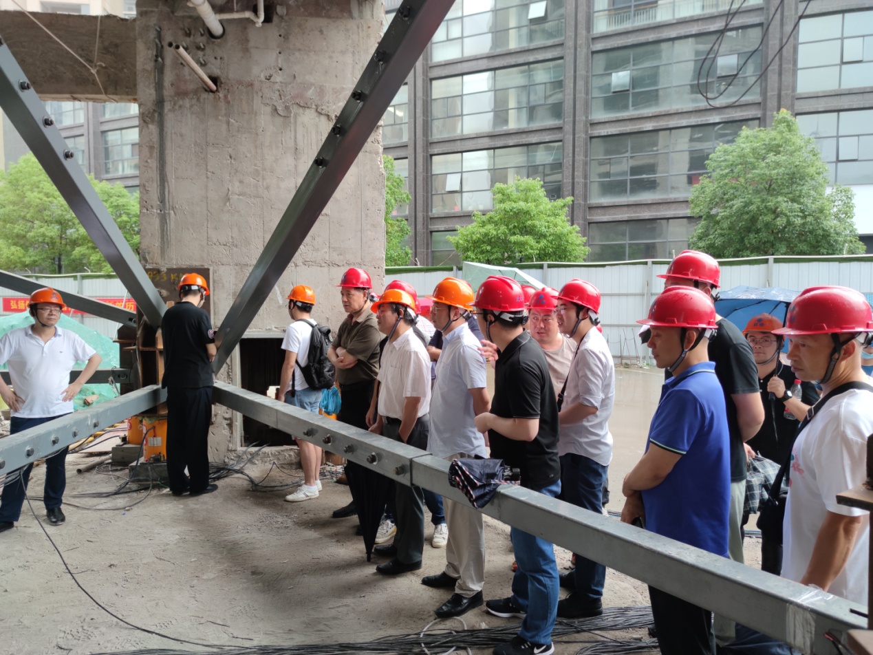 7月2日下午,在董事長(zhǎng)高作平教授的帶領(lǐng)下,公司董事、監(jiān)事、專家、經(jīng)理層等30余人來到武漢市科技館項(xiàng)目部觀摩指導(dǎo)現(xiàn)場(chǎng)頂升糾偏施工預(yù)頂試驗(yàn)。