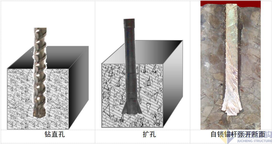 擴孔自鎖錨固技術(shù)的工藝是先鉆直孔,再使用擴孔鉆頭在孔底擴孔,然后注入無機注漿料,再將自鎖錨桿插入孔中,通過加壓或沖擊使錨桿在孔底張開形成機械自鎖。