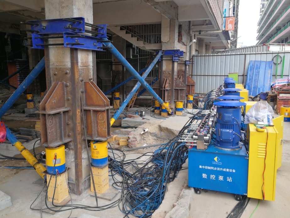 巨成結構是中國標準化協會標準《鋼滑道頂升改造老舊小區技術規程》和湖北省地方標準《鋼滑道頂升增層技術規程》的主編單位。本次糾偏采用的是巨成群控同步頂升成套設備。巨成結構在2021年12月8日發布了集中控制同步頂升成套設備,采用了德國西門子的5種芯片,讓頂升、糾偏、平移、旋轉,實現了數字化信息化。目前已升級為群控同步頂升成套設備,可同時控制30000個千斤頂,誤差在0.3mm以內。