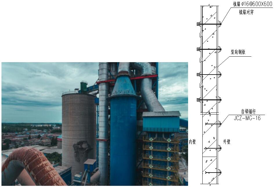 該項?位于湖北省老河口?泥?內,廠內?料均化庫建成于2009年。庫容量為2萬噸。該庫于2009年正式投產,為?座單體圓形鋼筋混凝?筒倉結構。該?料均化庫庫體外壁在2021年8?22?突然出現破洞損壞,鋼筋裸露,破壞?積達到56m2,庫體因內部壓強突變,庫頂板發?嚴重的內凹變形,與鋼?房相連接鋼構件受拉發?嚴重變形以及錯位。應急處理?式中包括包鋼板加固,包鋼加固中采??鎖錨桿替代化學植筋后錨固。