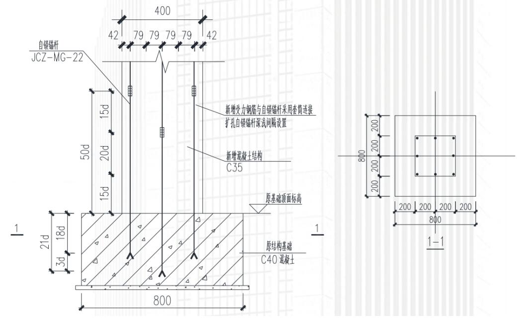 經改造加固設計,對經升級改造后的屋?結構、吊?梁、柱?進?了常規加固。原設計柱加固??房基礎頂?處(即室內地坪標?以下),由于地?處有設備影響開挖,?法實施。故調整設計?案:在不破除地坪前提下,??鎖錨桿從地坪打孔?基礎頂?以下錨固深度,代替地?以下原加?截?受拉鋼筋。