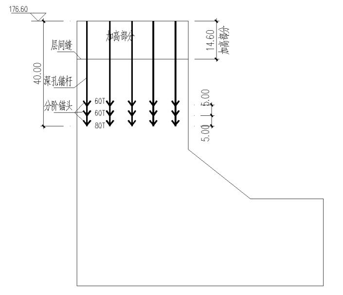 根據(jù)設(shè)計(jì),閘墩新增1000噸預(yù)應(yīng)力根據(jù)計(jì)算每個(gè)閘墩增加1000噸預(yù)應(yīng)力,長(zhǎng)度45m,每個(gè)閘墩5孔,每孔200噸。內(nèi)錨頭分為3層,3層內(nèi)錨頭上下分布間距間隔5m,底層80噸,上面兩層各60噸。