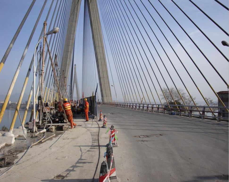 鄖陽(yáng)漢江公路大橋位于湖北?堰市,是209國(guó)道上的重要橋梁,1989年11月動(dòng)工,1994年2月通車(chē)。后發(fā)現(xiàn)箱型墩側(cè)壁出現(xiàn)側(cè)向裂縫,原因分析可能是預(yù)應(yīng)力失效所致。應(yīng)用武大巨成公司預(yù)應(yīng)力自鎖錨桿對(duì)橋臺(tái)進(jìn)行加固,單根自鎖錨桿預(yù)應(yīng)力為561kN。