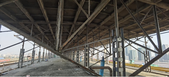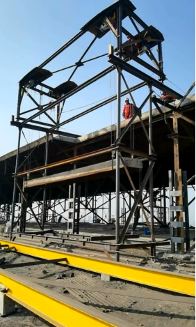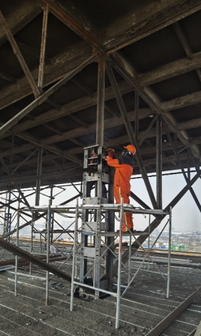 目前,項目部約有200人正緊鑼密鼓地開展鋼天窗架頂降的相關施工準備工作,如鋼滑道安裝、天窗架構件加固、縱橫向支撐安裝、設備安裝調試等。