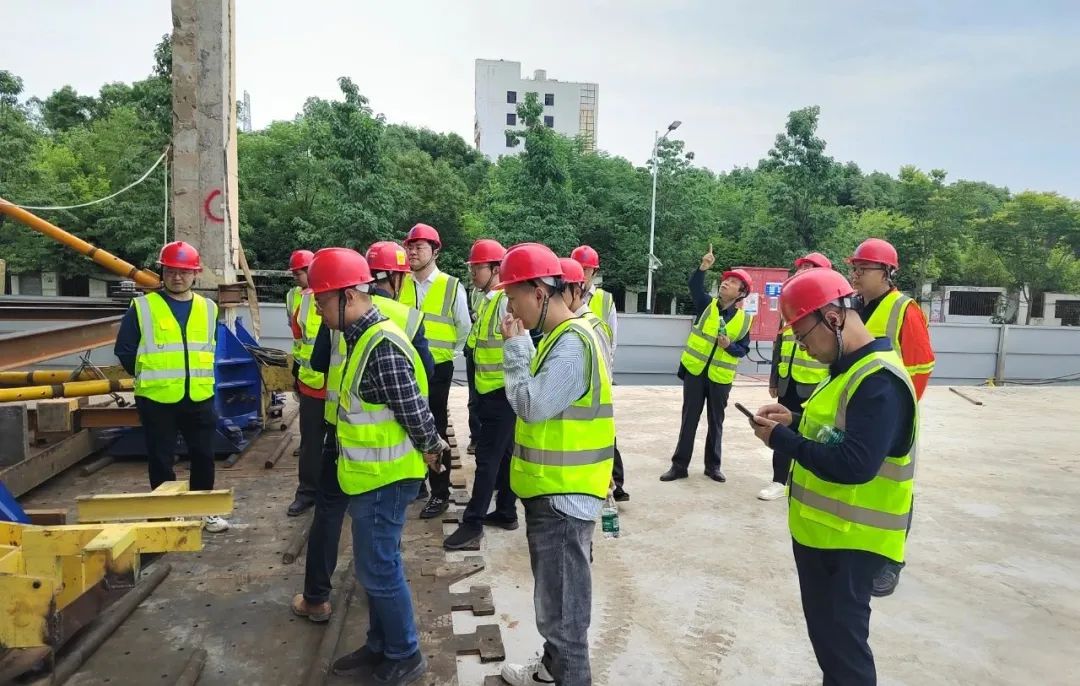 參訪團第一站來到鄂州電廠消防站遷移項目,巨成結構執行董事盧亦焱教授陪同。項目現場指揮長王金剛向各位來賓介紹了項目情況,此次遷移工程采用了巨成公司自主研發的鋼滑道剛性平面軸心旋轉法與鋼滑道頂推平移法,整體實施過程包含兩次旋轉以及兩次平移。前期已成功實施了第一階段逆時針旋轉28°、平移99米以及第二階段順時針旋轉28°的工作,目前正在進行第二階段平移106米的施工,預計將在6月6日完成最終平移任務,確保消防站精確無誤地遷移到新址。